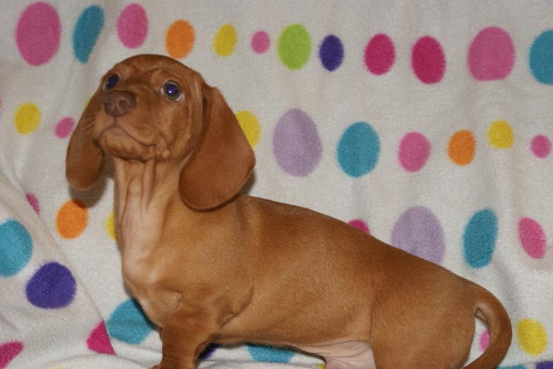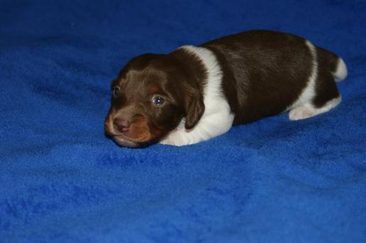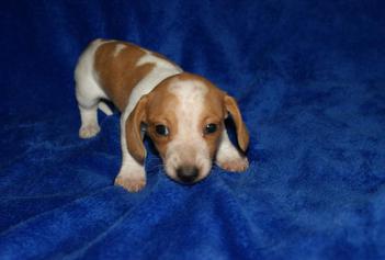 Sav 8-2 Red smooth coat piebald female $1,500 AKC pet registration . Placed with her sister and living with new parents in Arkansas. New Dachshund Razorback fans!